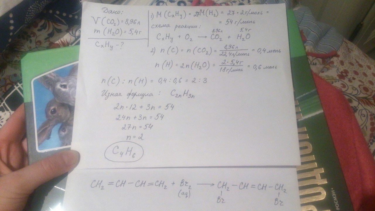 При полном сгорании углеводорода образовалось 8,96л (н. у.) диоксида углерода и 5,4 г воды. Молярная масса углеводорода в 27 раз больше малярной массы водорода. При исследовании химических свойств этого вещества установлено, что оно обесцвечивает бромную воду. На основании данных условия задачи: