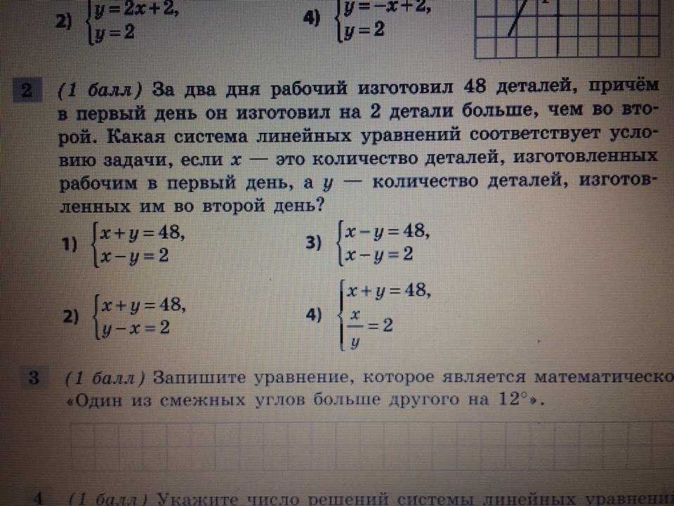За два дня рабочий изготовил 48 деталей ,причём в первый день он изготовил на 2 детали больше,чем во второй.Какая система линейных уравнений соотвествует условию задачи ,если x-это количество деталей,изготовленных рабочим в первый день,а y-это количество деталей,изготовленных им во второй день ?