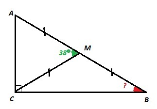 В прямоугольном треугольнике ABC (угол C прямой) проведена медиана CM. Найдите угол B (в градусах), если угол AMC равен 38∘градусов