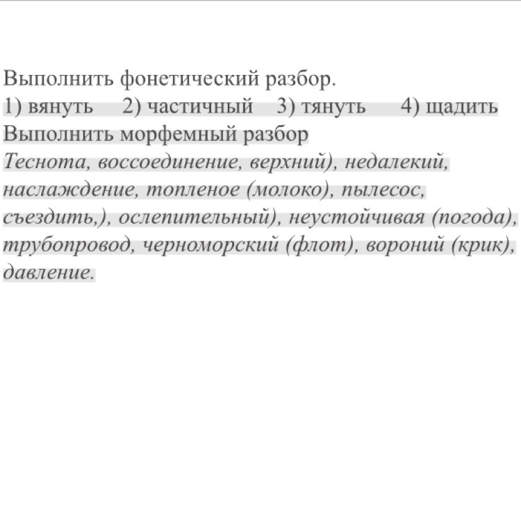 ч→[ч']:согласный, непарный глухой, непарный мягкийа→[и]:гласныйс→[с']:согласный, парный глухой, парный мягкийт→[т']:согласный, парный глухой, парный мягкийи→[и]:гласныйч→[ч']:согласный, непарный глухой, непарный мягкийн→[н]:согласный, непарный звонкий, сонорный, парный твёрдыйы→[ы]:гласныйй→[й']:согласный, непарный звонкий, сонорный, непарный мягкийВ слове «вя́нуть»: слогов—2 (вя-нуть), букв—6, звуков—5: