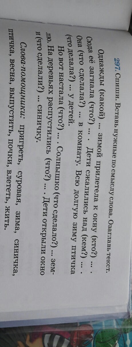 Однажды суровой зимой прилитела к окну птичка.Сюда её загнала зима.Дети сжалились над синичкой.Она влетела в комнату.Всю долгую зиму птичка жила у детей.