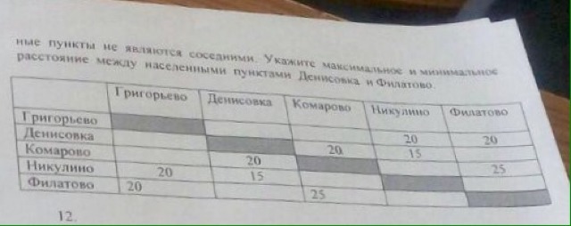 В таблице указано расстояние в километрах между соседними населёнными пунктами . Если пересечение строки и столбца пусто , то населенные пункты не являются соседними . Укажите максимальное и минимальное расстояние между населёнными пунктами Денисовка и Филатово .