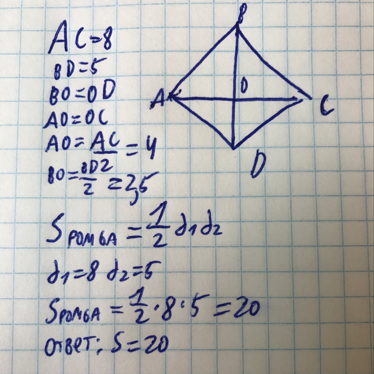 Площадь ромба равна половине произведения диагоналей