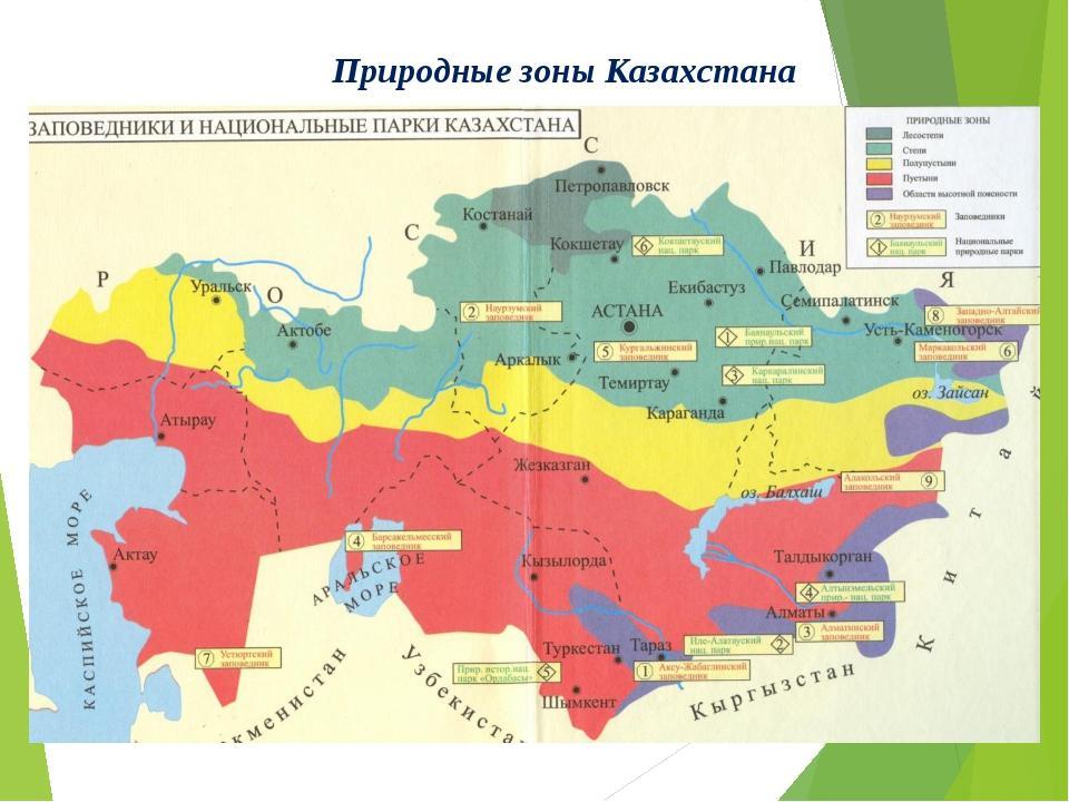 Если посмотреть на карту природных зон Казахстана,которая представлена ниже,то можно увидеть,что на севере страны расположена зона степей,южнее зона полупустынь,затем пустынь.В соответствии с этими зонами здесь размещено и характерное сельское хозяйство.