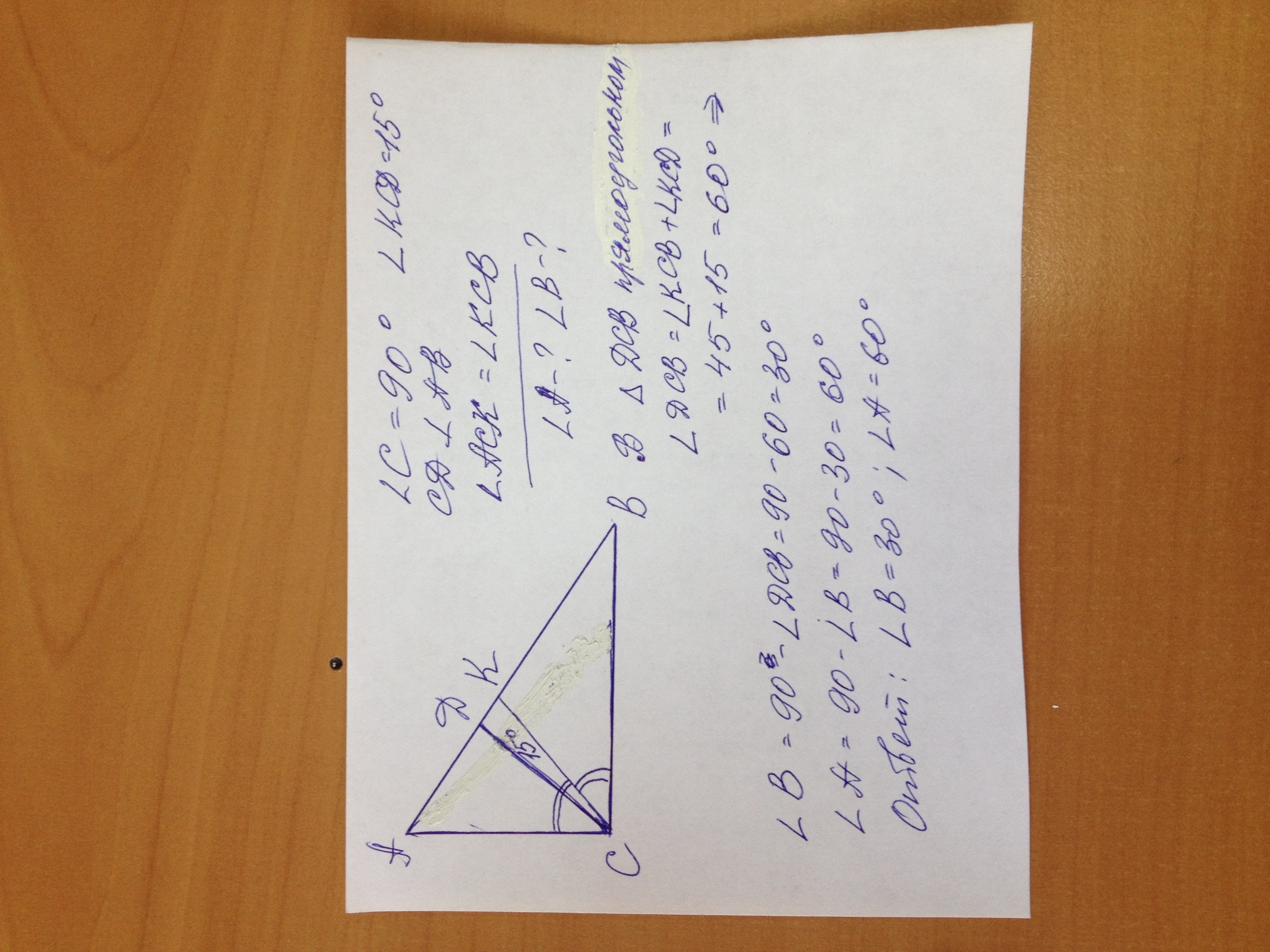 Найдите углы прямого треугольника, если угол между биссектрисой и высотой, проведенными из вершины прямого угла равен 15 градусов.