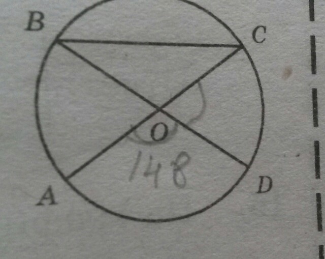 в окружности с центром О отрезки АС и BD- диаметры. угол AOD равен 148. найдите угол АСВ