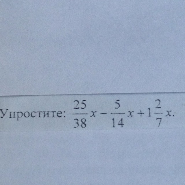 25х/38 - 5х/14 +1 2х/7 = 25х/38 - 5х/14 + 9х/7 = 175х/266 - 95х/266 + 342х/266 = 422/266 = 1 156 /266 = 1 78/133 х
