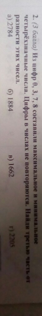 из цифр 0 3 7 8 составили максимальное и минимальное четырехзначные числа цифры в числах не повторяются Найди третью часть от разности этих чисел