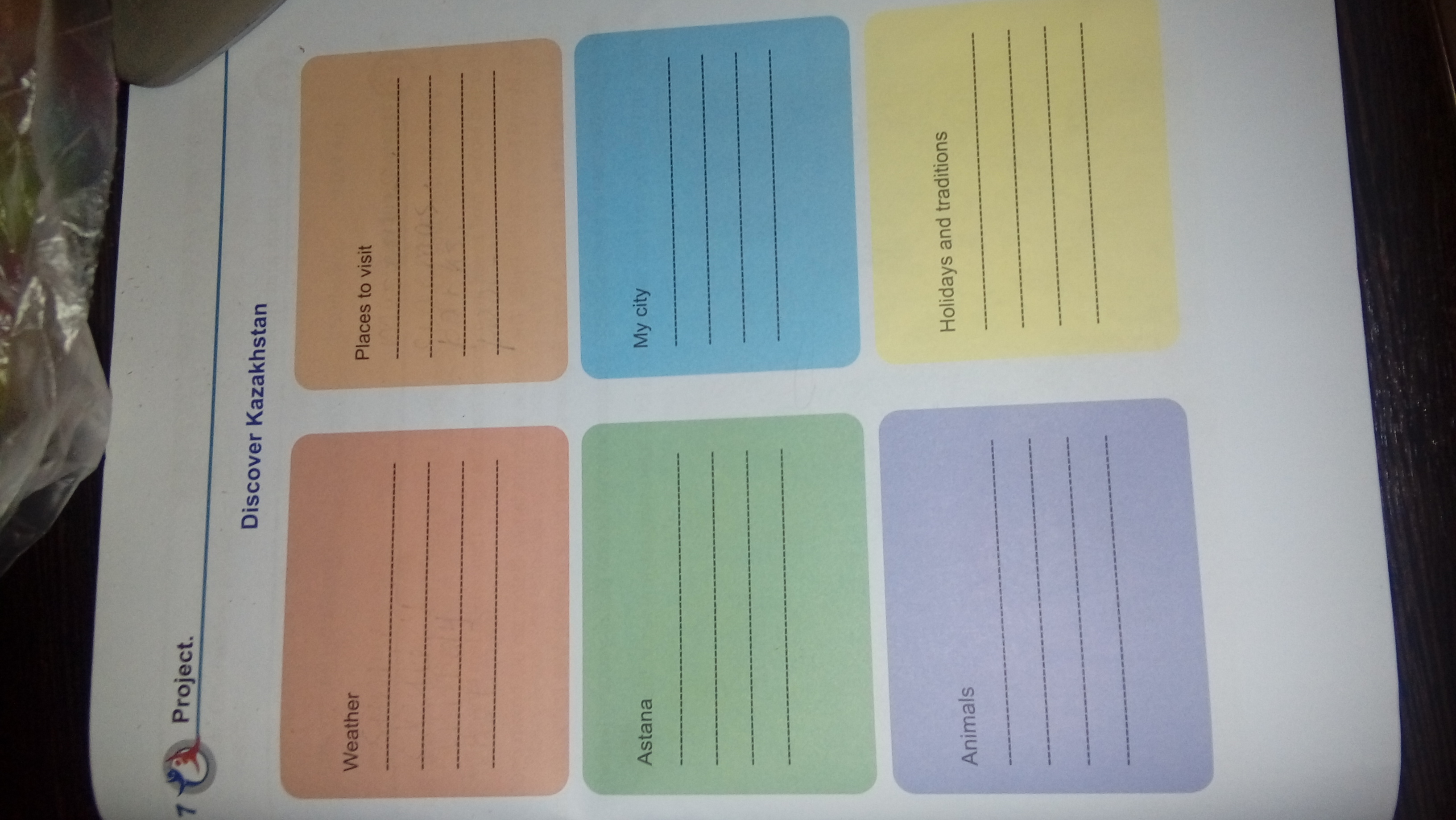 Weather-cloudy and windy, Astana-capital, My city-Alma-ata, Animals-bear, deer, boar, Places to visit-Baiterek, Norman Foster, Holidays and traditions- Respect for elders, the younger son became a warrior.