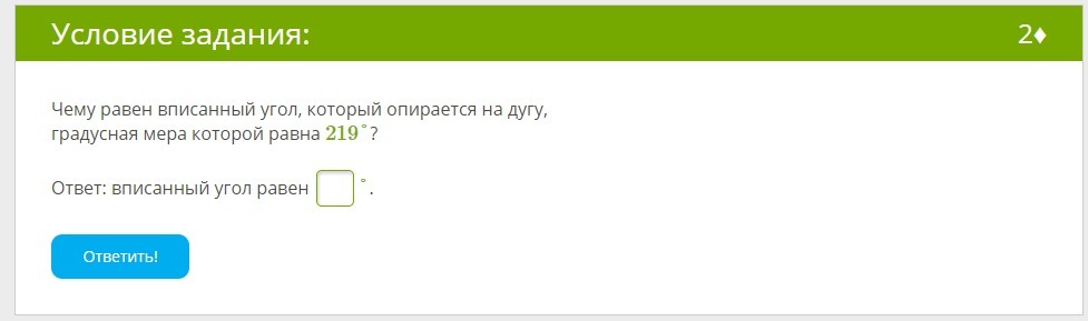 Т.к. вписанный угол равен половине дуги, то из этого следует, что вписанный угол в твоем задании равен 219°:2=109,5°