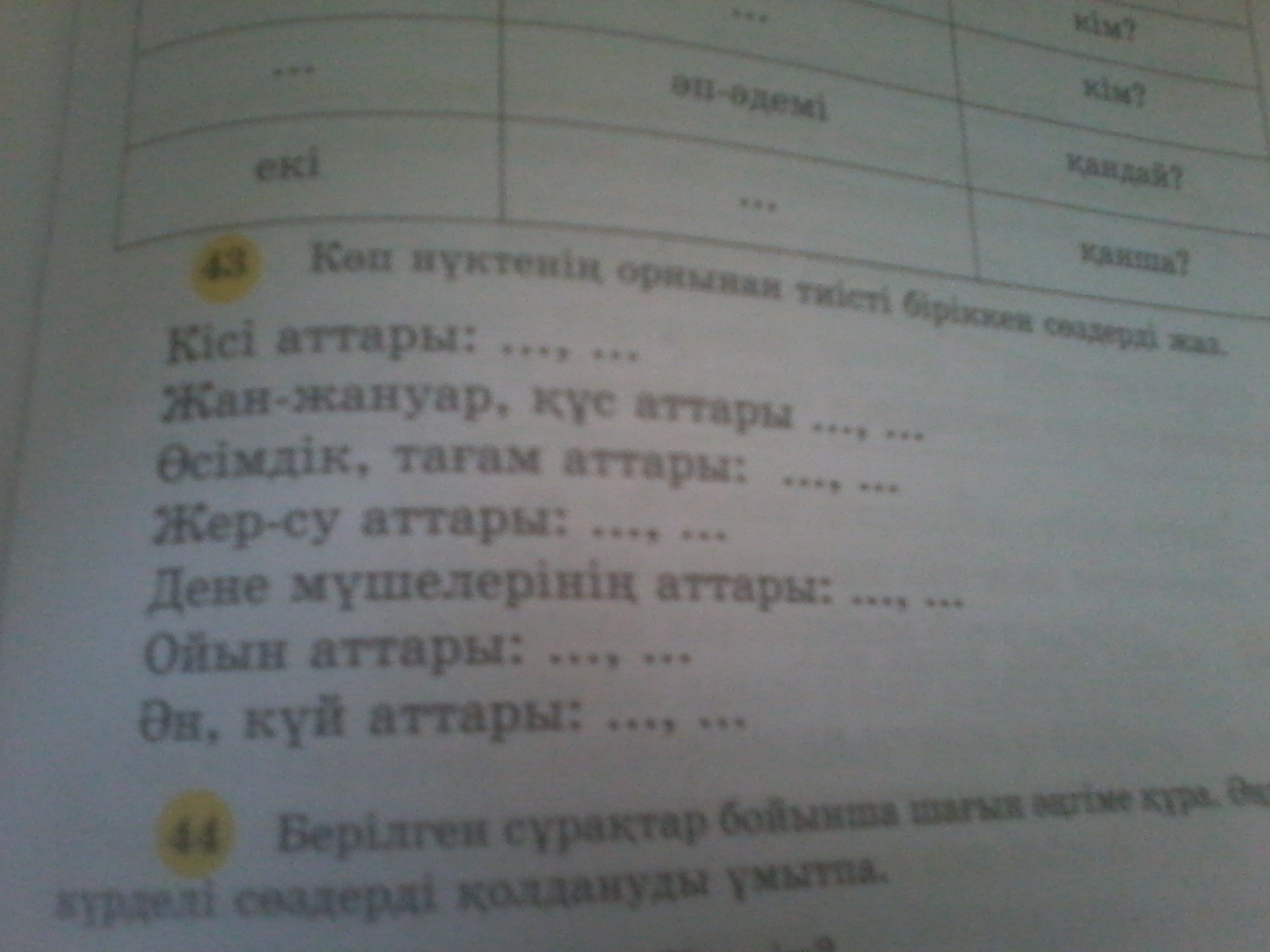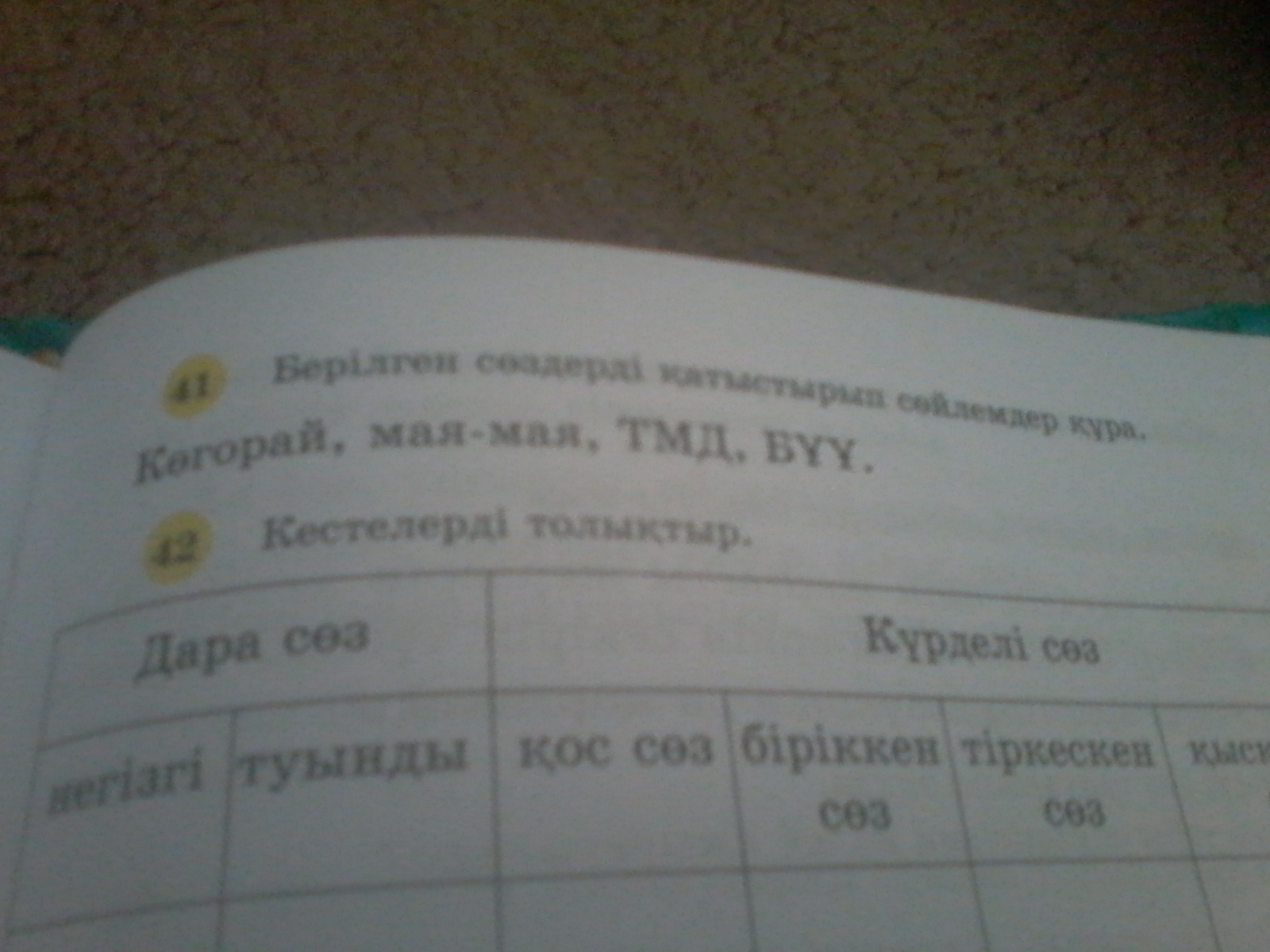 Негізгі ақыл, туынды ақылды, қос сөз : бір-біріне, біріккен сөз: алтыбақан, тіркескен сөз: қара торы, қысқарған сөз: ТМД( тәуелсіз мемлекеттер достастығы)