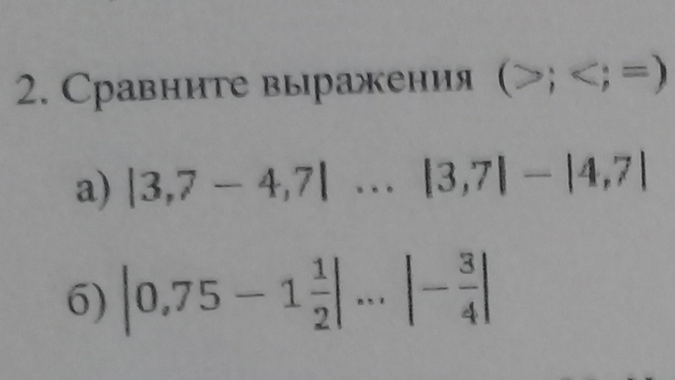 Кажется в а) > , потому, что |3,7-4,7|= |положительное число| ( из-за модуля) . А модуль числа 3,7 - модуль числа 4,7- это уже отрицательное число, т.к. 3 меньше 4.