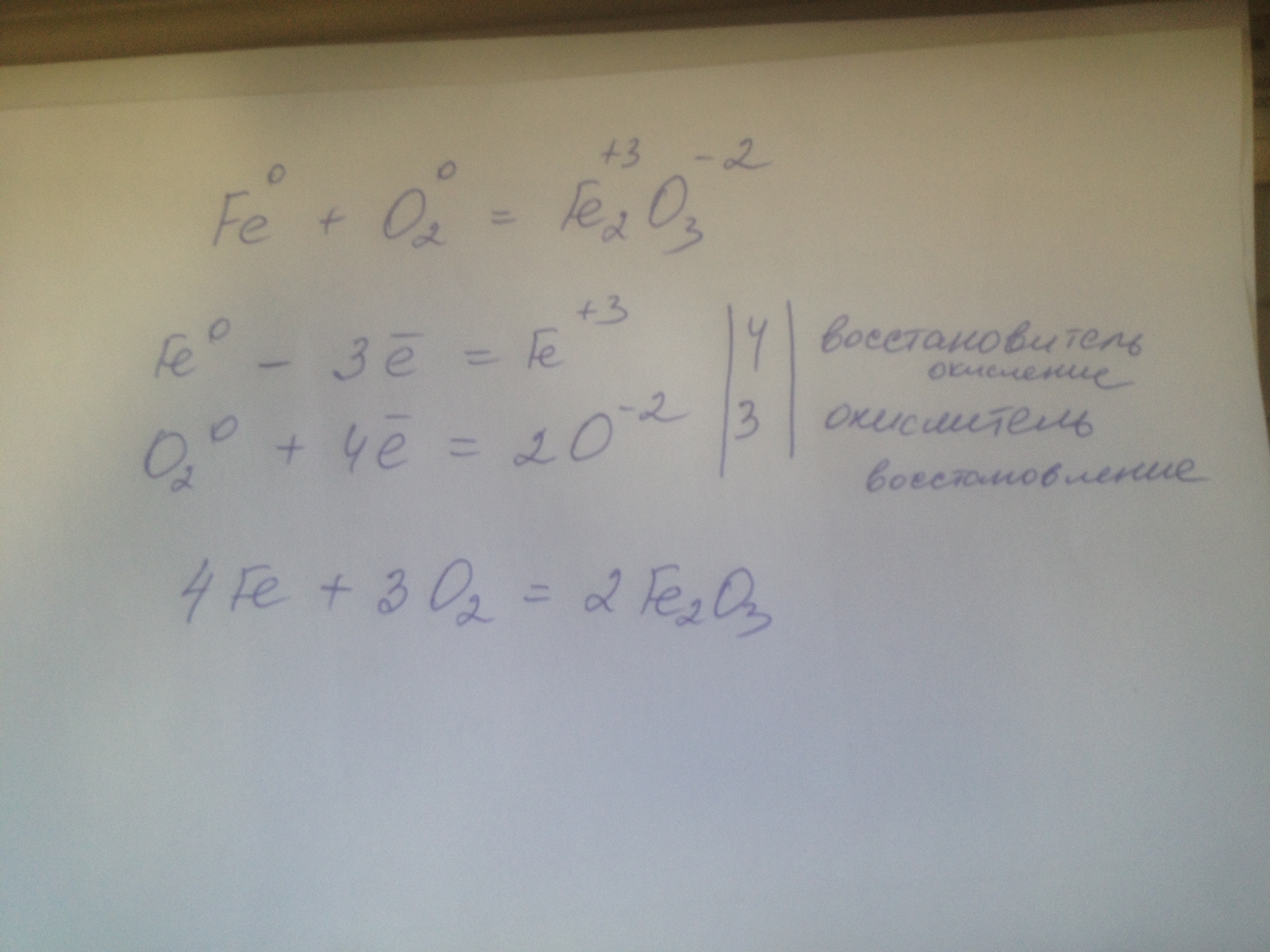 Fe (0) +3O2 (0) = 2Fe (+3) 2O3 (-2)