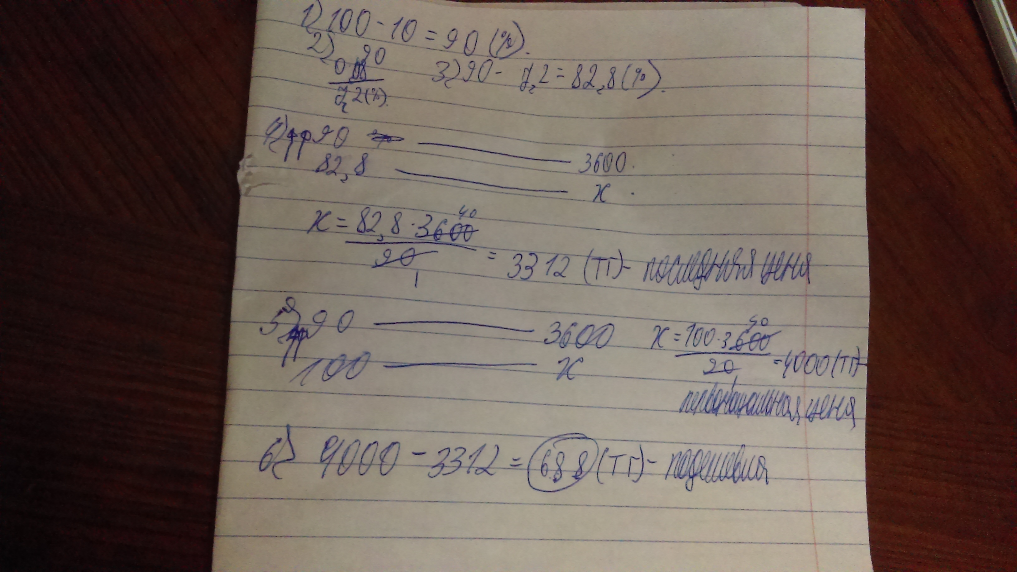 цена телефона в первый раз подешевела на 10% и составила 3600 тг,во второй раз подешевела на 8%.На сколько тг подешевела последняя цена телефона от первоначальной цены