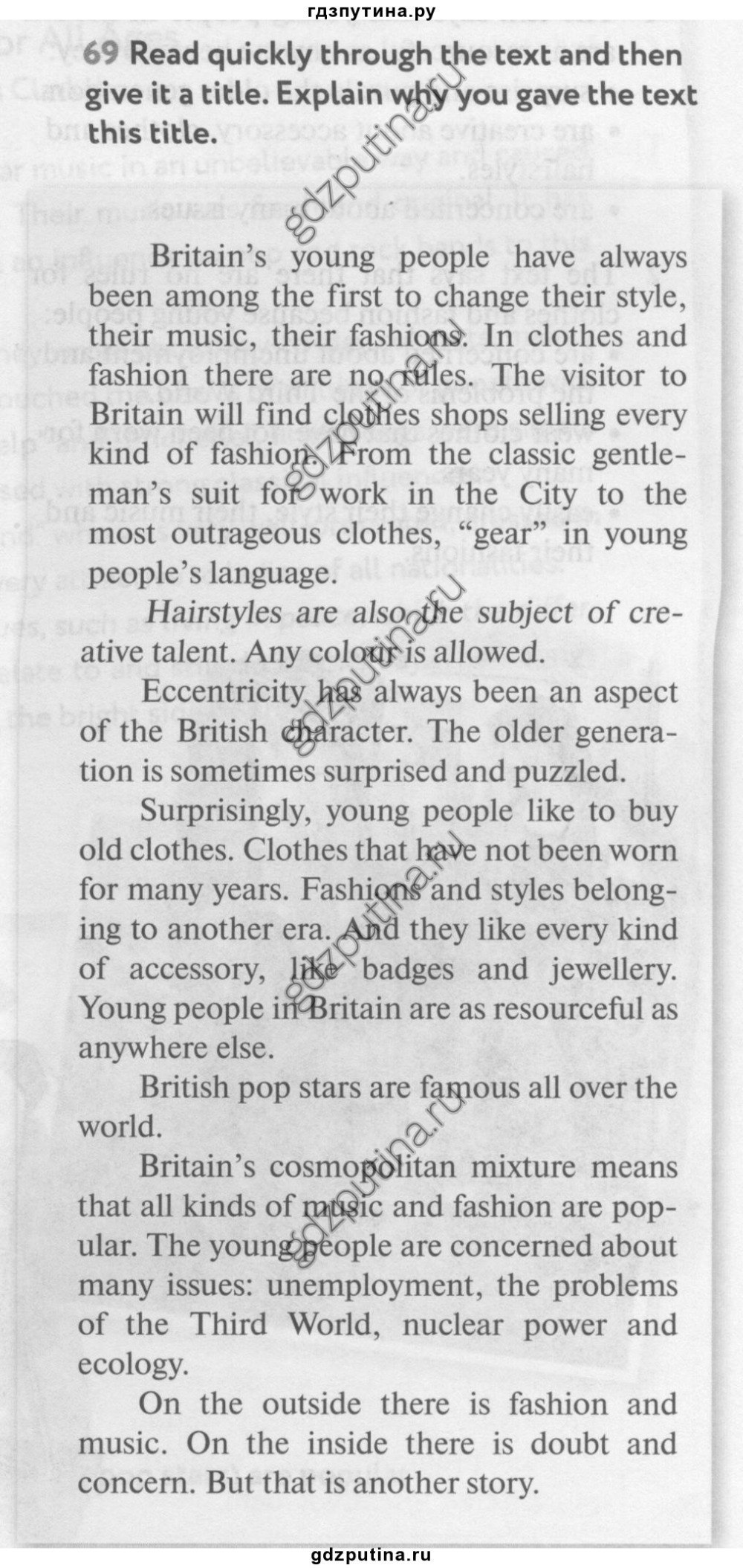 Как ни странно, молодежи нравится покупать старую одежду. Одежду, которую годами никто не надевал. Фасоны и стили, принадлежащие к другой эпохе. Им нравятся все виды аксессуаров - такие, как значки и бижутерия. Молодежь Британии так же изобретательна, как и любая другая.Британские поп-звезды известны по всем миру. Космполитичная британская смесь подразумевает, что все виды музыки и моды популярны.