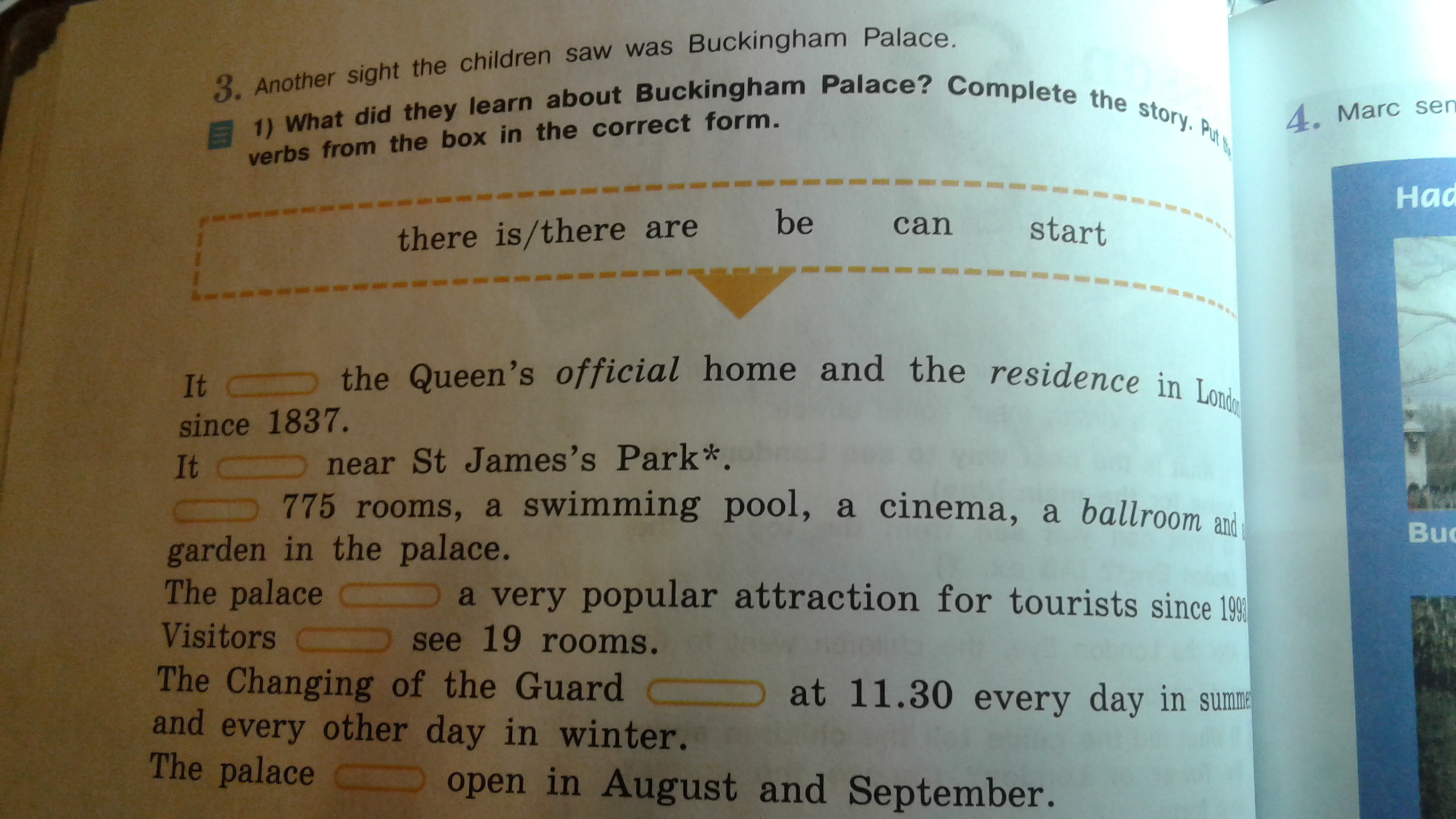 It _is__ the Queens official home and the residence in London since 1837.It _is__ near St James s Park_There are_ 775 rooms. a swimming pool.a cinema. a ballroom and a garden in the palace.The palace _has been_ a very popular attraction for tourists since 1993.Visitors __can__ see 19 rooms The Changing of the guard _ starts__ at 11.30 every day in summer and every other day in winter.The palace __is_ open in august and september