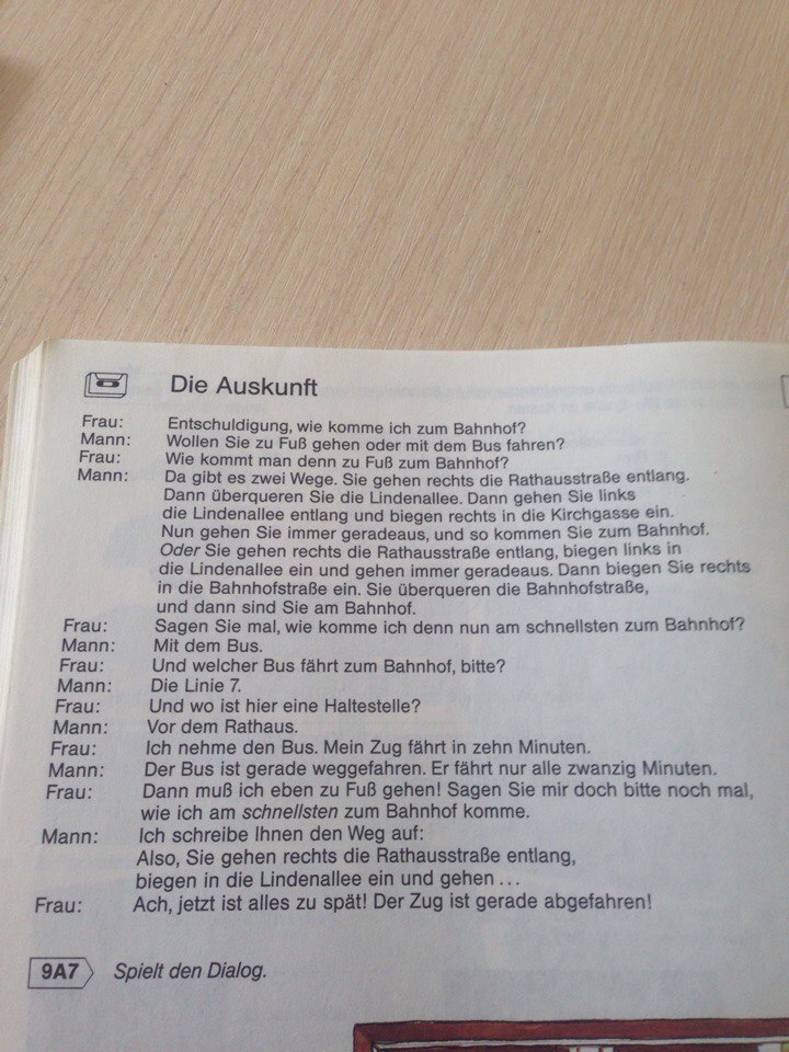 Ж:Тогда я должна идти пешком!Скажите мне,пожалуйста,ещё один раз,как я могу быстрей пройти к вокзалу?