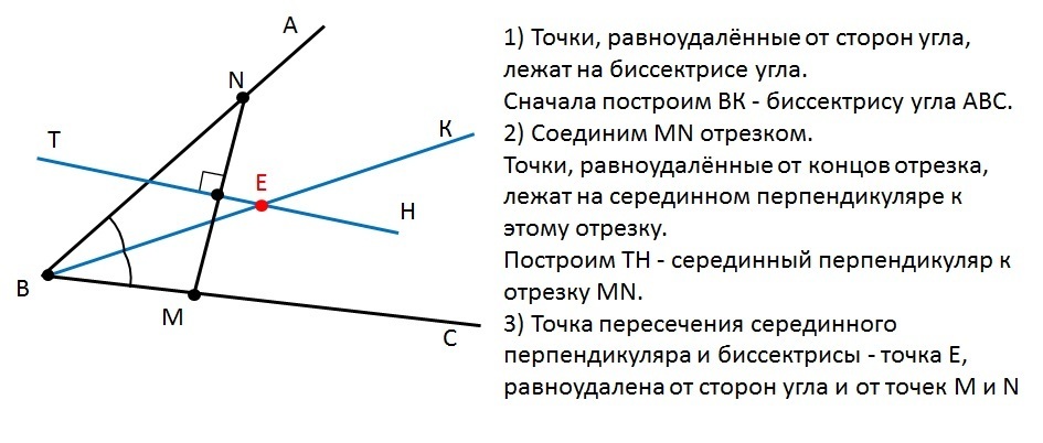 Лан угол ABC и точки M, N на его сторонах. Внутри угла найдите точку,одинаково удалённую от точек M и N и находящуюся на одинаковом от сторон угла .