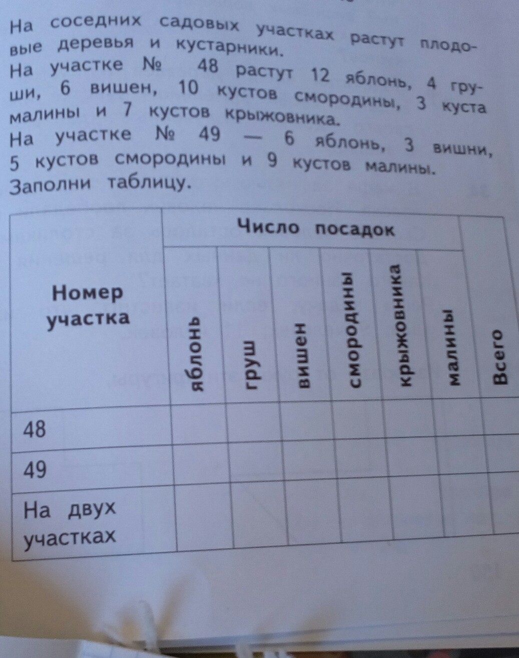 Просто надо сначала заполнить сколько чего выросло на участках 48, 49. Затем в столбцах заполнить На двух участках, суммировать яблони, груши и т. д. на 48,49 участках, а в строках суммировать общее количество фруктов.