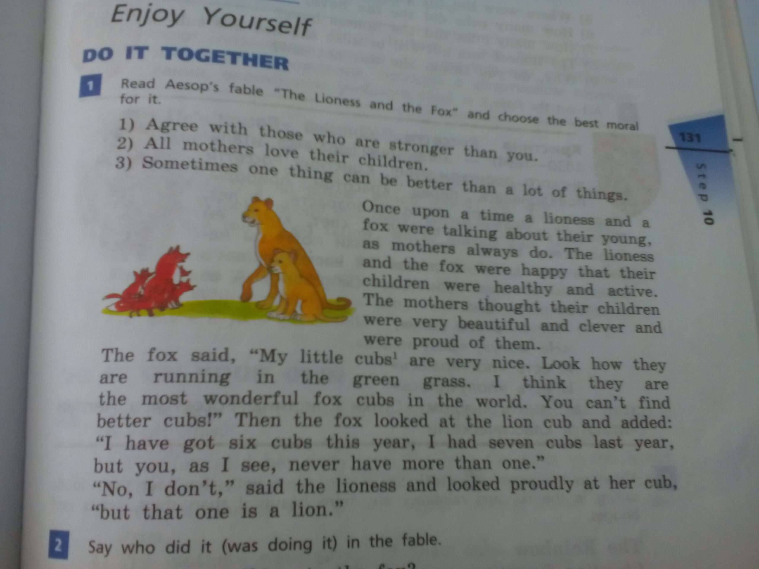 1. 1) Соглашайтесь с теми, кто сильнее вас. 3) Иногда один из их детей может быть лучше многих вещей. Когда львица и мама говорили о своих материнских делах, они всегда счастливы, что их дети были здоровыми и активными. Мать думала, что их дети были очень красивы и умны, и лиса гордилась ими. Говорят: «Мои маленькие очень милые. Посмотрите, как они бегут по зеленой траве. Я думаю, что самые замечательные лисицы в мире. Вы не можете найти лучших детёнышей! »Затем лиса посмотрела на львенка и добавила:« У меня в этом году шесть детёнышей, в прошлом году у меня было семь эб, но у вас, как я вижу, никогда не было больше одного. «Нет, я не сказал львицы и гордо взглянул на ее детёныша, - но этот - лев».