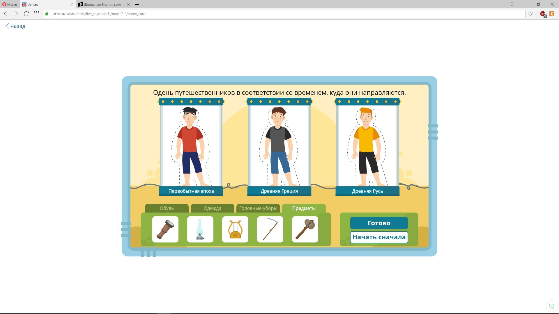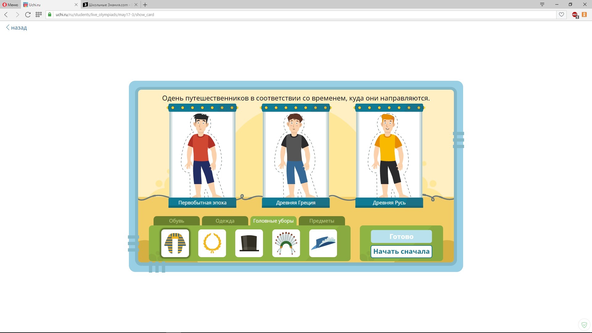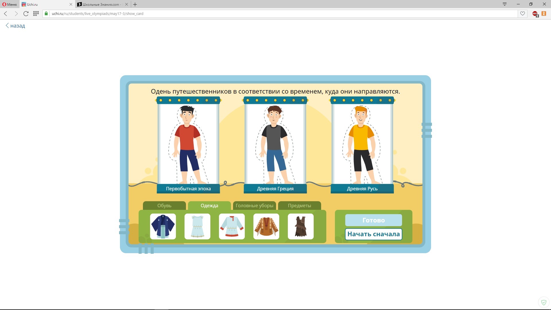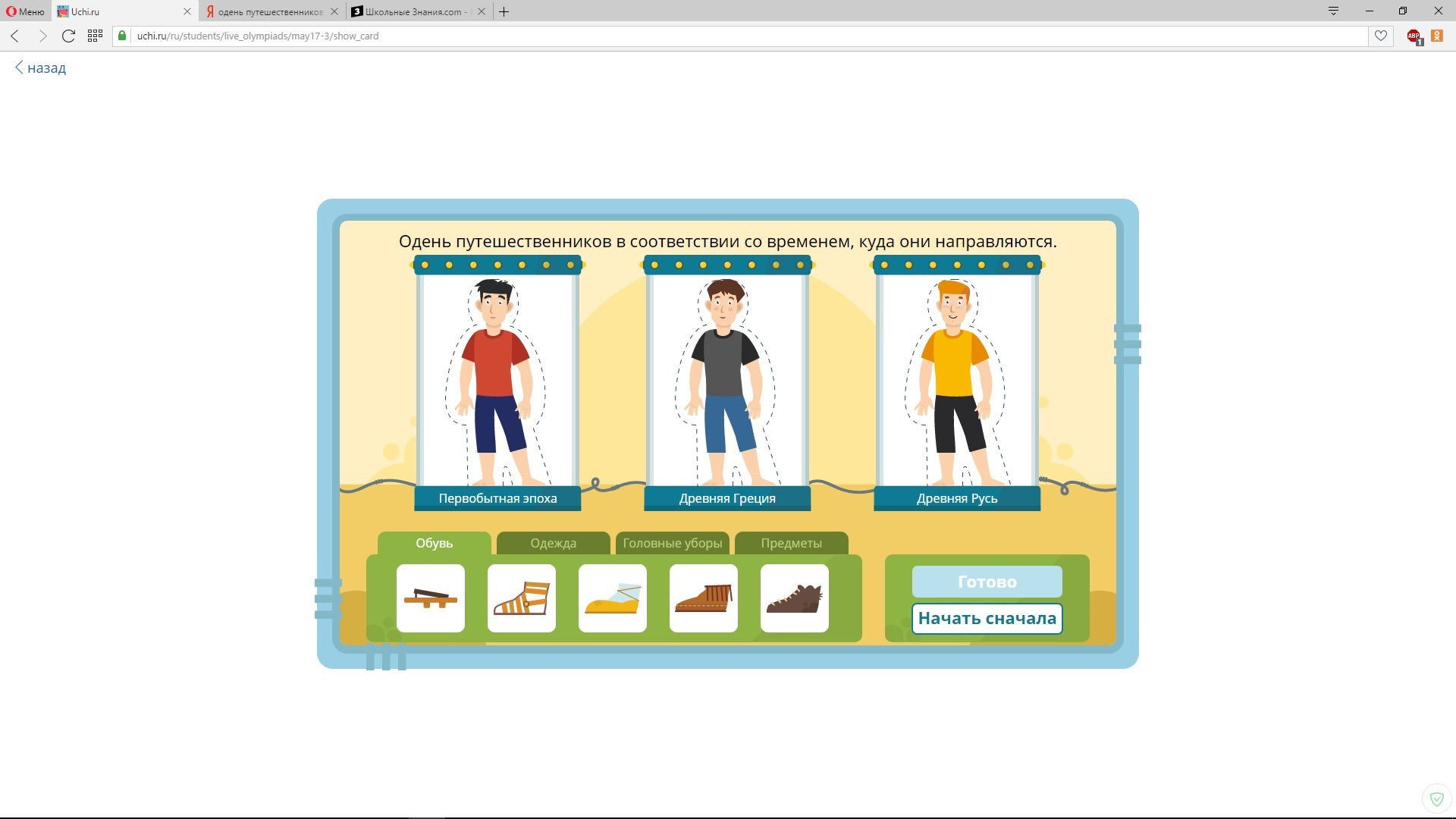 Ну первобытный путешественник должен быть на босую ногу,в шерстяной повязку на теле , тот что в Древню Грецию должен быть в белой повязке на теле, и в сандалях того врепени, В древнюю Русь в тапочках (под 3 номером) и в штанах и рубашке с орнаментом.