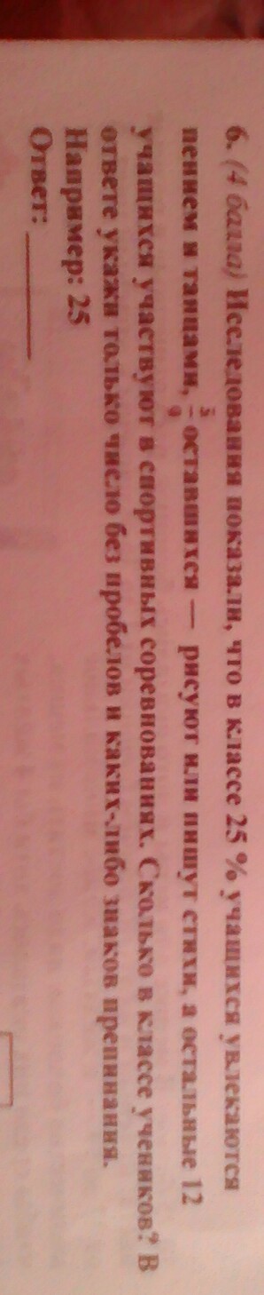 исследования показали что в классе 25% учащихся увлекаются пением и танцами 5 девятых дробь оставшихся рисуют или пишут стихи остальные 12 учащихся участвовать в спортивных соревнованиях Сколько в классе учеников в ответе Укажите только число без пробелов и каких-либо знаков препинания