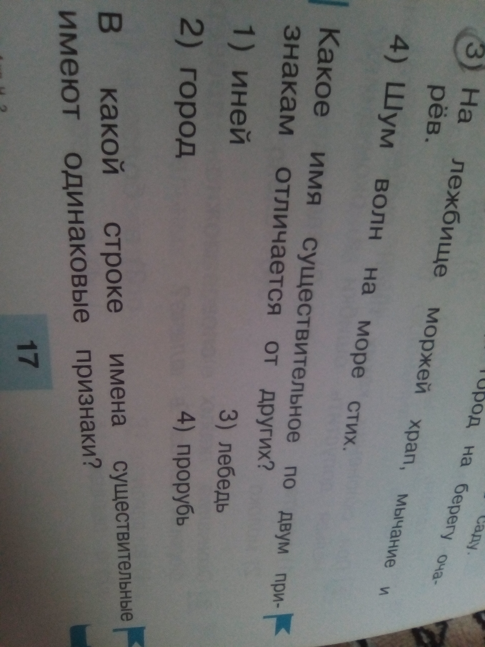 Какое имя существительное по двум признакам отличается от других? 1. Иней 2. Город 3. Лебедь 4. Прорубь.