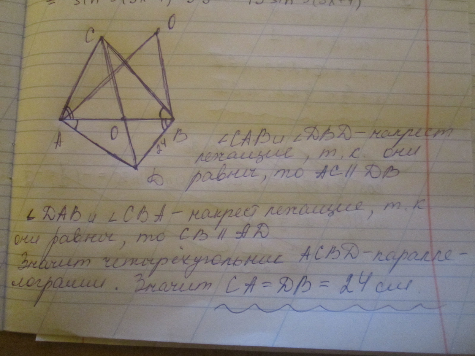 Даны треугольники АСВ и АОВ с общим основанием AB. CD пересекается с АВ в точке О. угол DAB=углу СВА,угол САВ=углу DВА,DB=24 см. Найти СА