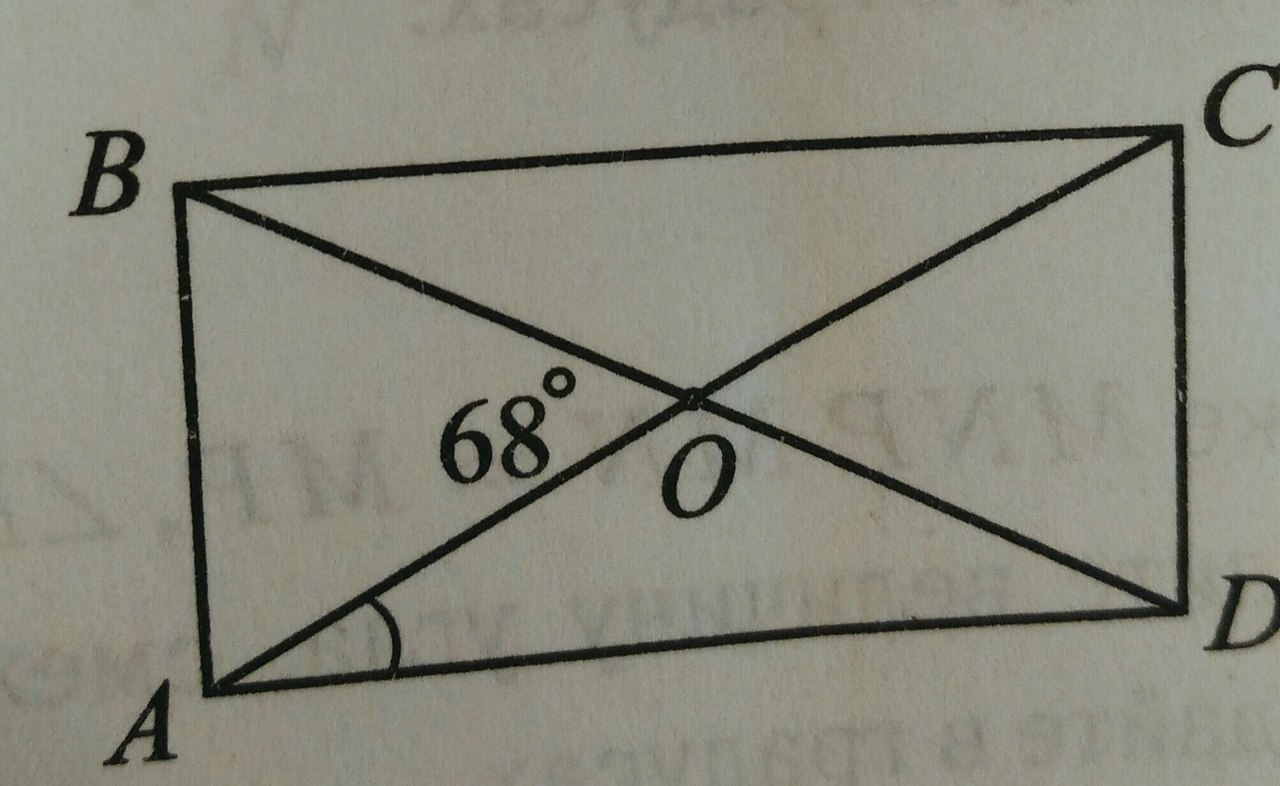 В прямоугольнике угол между диагоналями = 68 градусов.Найдите угол между диагональю и большим основанием прямоугольника.Ответ дайте в градусах.