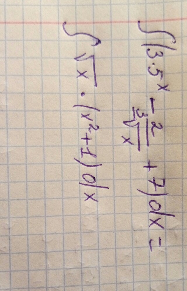 1.![3* intlimits {5^x},dx -2 intlimits{x^{-1/3}} ,dx + intlimits {7},dx = frac{3*5^x}{ln5} -3* sqrt[3]{x^2} +7x+C 3* intlimits {5^x},dx -2 intlimits{x^{-1/3}} ,dx + intlimits {7},dx = frac{3*5^x}{ln5} -3* sqrt[3]{x^2} +7x+C](https://tex.z-dn.net/?f=3%2A+intlimits+%7B5%5Ex%7D%2Cdx+-2+intlimits%7Bx%5E%7B-1%2F3%7D%7D+%2Cdx+%2B+intlimits+%7B7%7D%2Cdx+%3D+frac%7B3%2A5%5Ex%7D%7Bln5%7D+-3%2A+sqrt%5B3%5D%7Bx%5E2%7D+%2B7x%2BC)