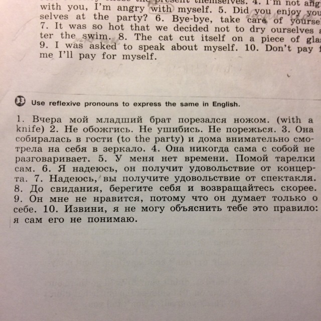 7. I hope you will enjoy yourself at the performance. 8. Good-bye, take care of yourself and come back soon! 9. I do not like him, because he thinks only of himself. 10. I am sorry, I can not explain this rule to you. I do not understand it myself.