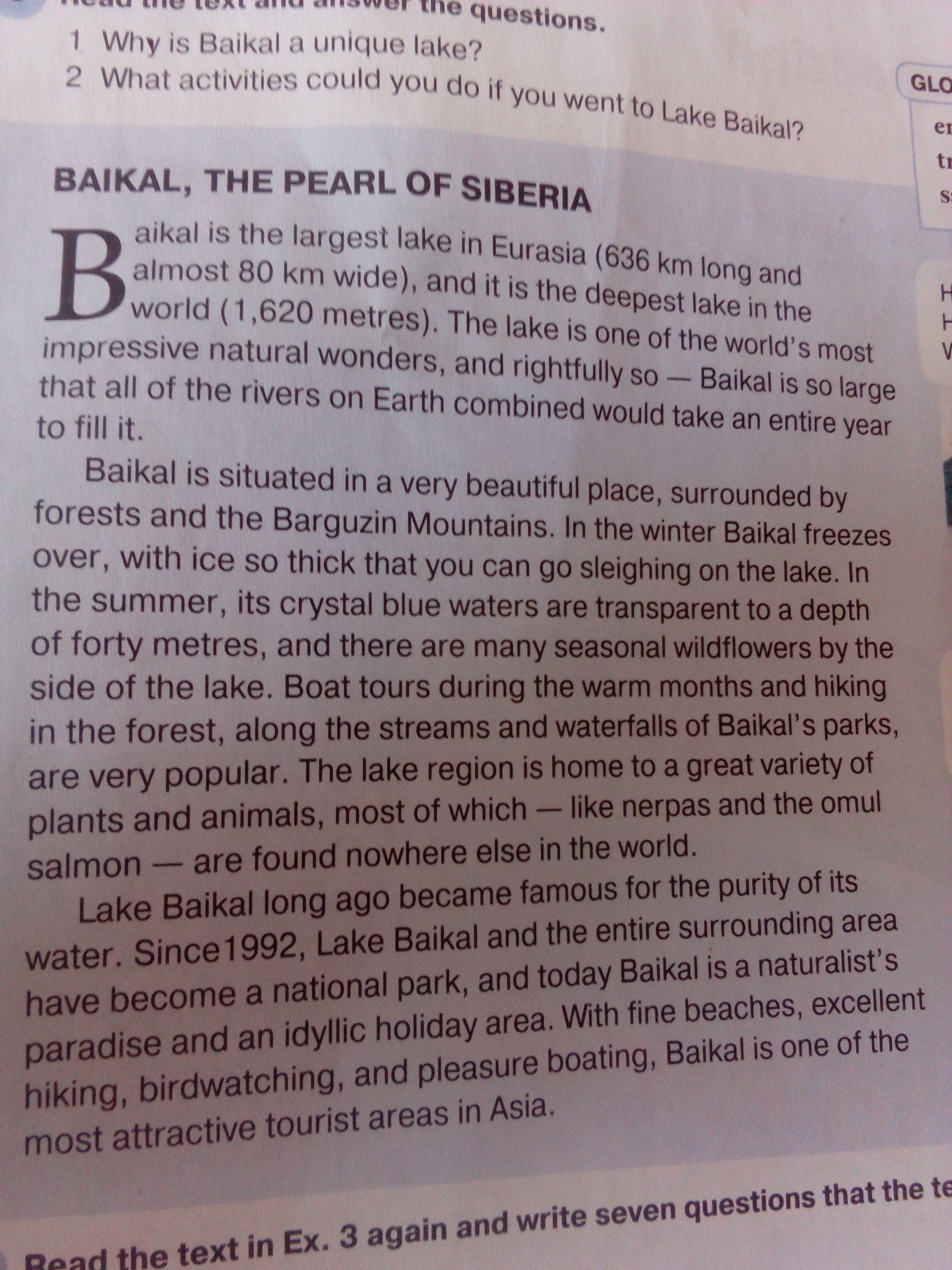 БАЙКАЛ-ЖЕМЧУЖИНА СИБИРИ. Байкал - самое большое озеро в Евразии (636 км в длину и почти 80 км в ширину), и это самое глубокое озеро в мире (1620 метров). Озеро является одним из самых впечатляющих природных чудес в мире, и по праву Байкал настолько велик, что все реки на Земле в совокупности займут целый год, чтобы заполнить его. Байкал расположен в очень красивом месте, в окружении лесов и Баргузинских гор. Зимой Байкал замерзает, со льдом настолько густым, что вы можете ходить на санях по озеру. Летом его кристально-голубые воды прозрачны на глубину до сорока метров, и рядом с озером есть множество сезонных полевых цветов. Очень популярны прогулки на лодках в теплые месяцы и походы в лесу, вдоль ручьев и водопадов в байкальских парках. Озерная область является родиной большого разнообразия растений и животных, большинство из которых ke нерпы и омуль лосося больше нигде в мире. Озеро Байкал давно прославилось своей чистотой. С 1992 года озеро Байкал и окружающая территория превратились в национальный парк, а сегодня Байкал - рай для натуралистов и идиллический курортный район. С прекрасными пляжами, отличным пешим туризмом, наблюдением за птицами и прогулками на лодках, Байкал является одним из самых привлекательных туристических районов в Азии.