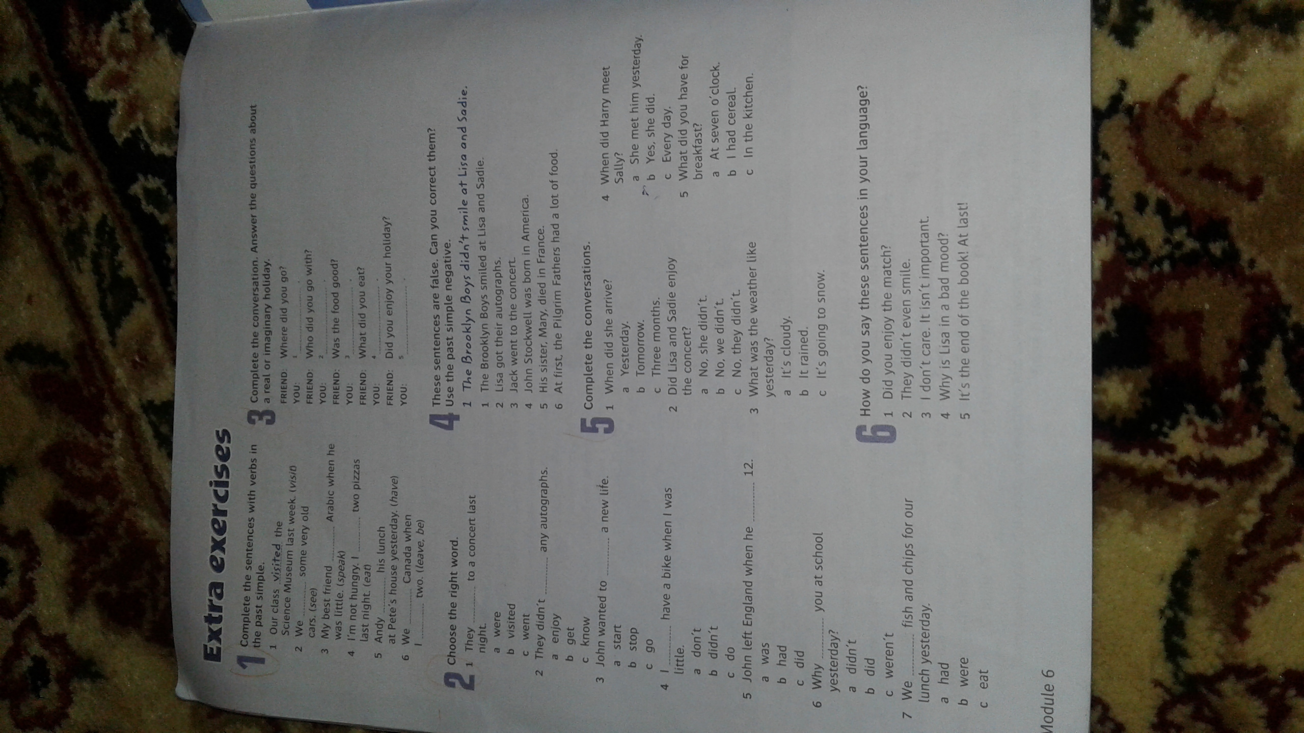 1) Тебе понравился матч? 2)Они даже не улыбнулись. 3) Мне всё равно. Это не важно. 4)Почему Лиза в плохом настроении? 5) Это конец книги! Наконец!