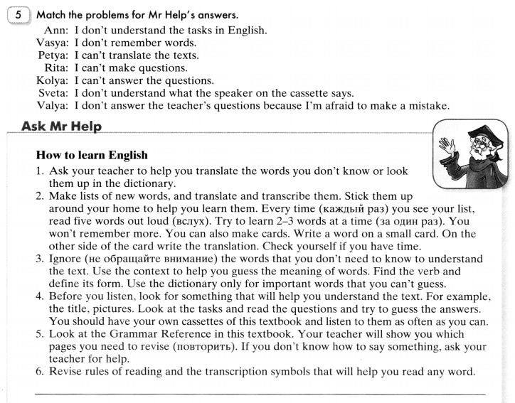1. Спросите учителя, чтобы помочь вам переводить слова, которые Вы не знаете или посмотретьих в словаре.2. Составлять списки новых слов, и переводить и транскрибировать их. Руки Вверхвокруг вашего дома, чтобы помочь вам узнать их. Каждый раз (каждый раз) вы увидите список.читать пять слов вслух (bcnyx) попробуй выучить 2-3 слова за раз (сапа) Выне помню больше. Вы также можете сделать карты. Написать слово на маленькой карточке. Надругой стороне карты напишите перевод. Проверьте себя, если у вас есть время.3 игнорировать (он oopamaire Bhomalne) слова, которые вам не нужно знать, чтобы пониматьтекст. Используйте контекст, чтобы помочь вам догадаться о значении слова. Найти глагол иопределить его форму. Использовать словарь только для важных слов, которые Вы не можете угадать.4 прежде чем слушать, искать то, что поможет вам понять текст. Например.название, картинки. Посмотрите на задачи и прочитать вопросы и попытаться угадать ответы.Вы должны иметь свой собственный кассет этот учебник и слушать их как можно чаще.5 посмотреть на Справочник по грамматике в этом учебнике. Ваш учитель покажет вам, какиестраницы, которые вы должны пересмотреть (nobtopit) если Вы не знаете как что-то сказать, попросить вашучителю за помощью.6 пересмотреть правила чтения и символы транскрипции, которые помогут вам прочитать любое слово.