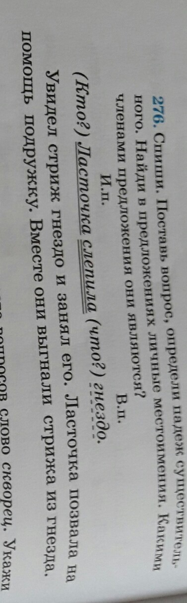 (Кто?)Стриж увидел(что?)гнездо и занял его. Стриж (И.п),Гнездо(В.п).(Кто?)Ласточка позвала(Кого?)На помощь подружку.Ласточка(И.п) Подружку(В.п).(Кто?)Они выгнали (Кого?)Стрижа из гнезда.Они-это местоимение