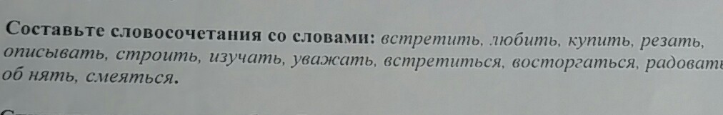 встретить друга, горячо любить, купить в магазине, резать тонко, описывать в сочинении, строить забор, внимательно изучать, уважать старших, встретиться на дороге, восторгаться поэтом, радовать маму (радоваться дождю), обонять воздух, смеяться над собой