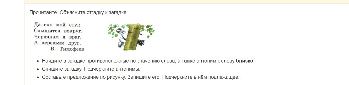 Далеко мой стук слышится вокруг. Червякам я враг, а деревьям друг.(найдите в загадке противоположные по значению слова,а также антоним к слову близко.спишите загадку. Подчеркните антонимы. Составьте предложение по рисунку. Запишите его подчеркните в нём подлежащие.