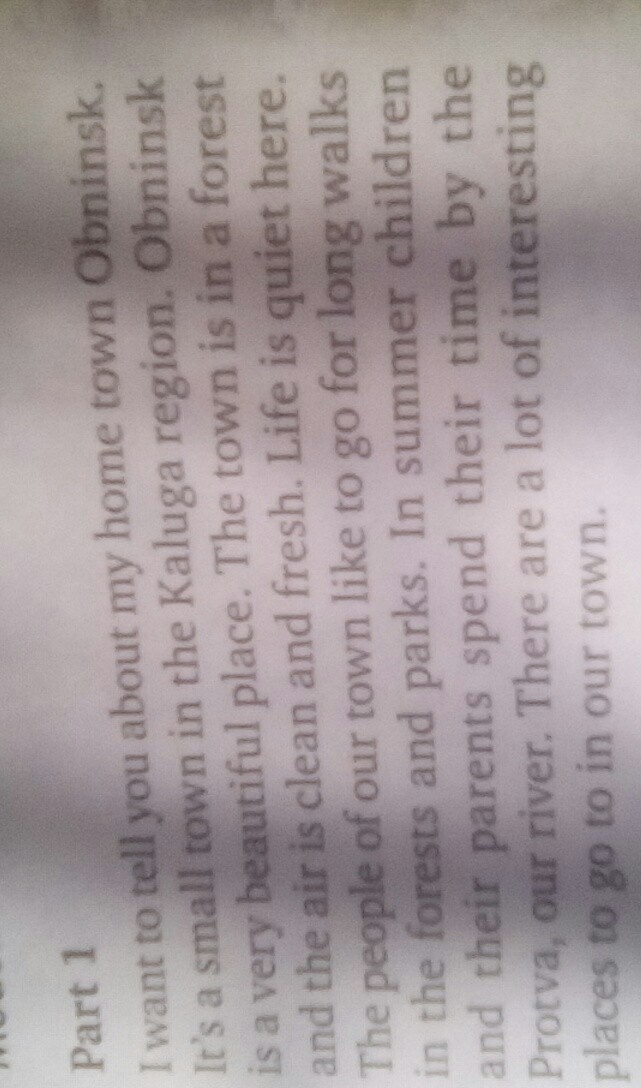 Я хочу рассказать тебе про мой родной город Обнинск. Это маленький город, в районе Калуги. Обнинск очень красивое мест. Город весь в лесах и воздух очень чистый и свежий. Жизнь тут тихая. Люди нашего города любят ходить на долгие прогулки в леса и парки. летом, дети и их родители проводят время возле Протвы, нашей речки. тут очень много интересных мест куда пойти в нашем городе.