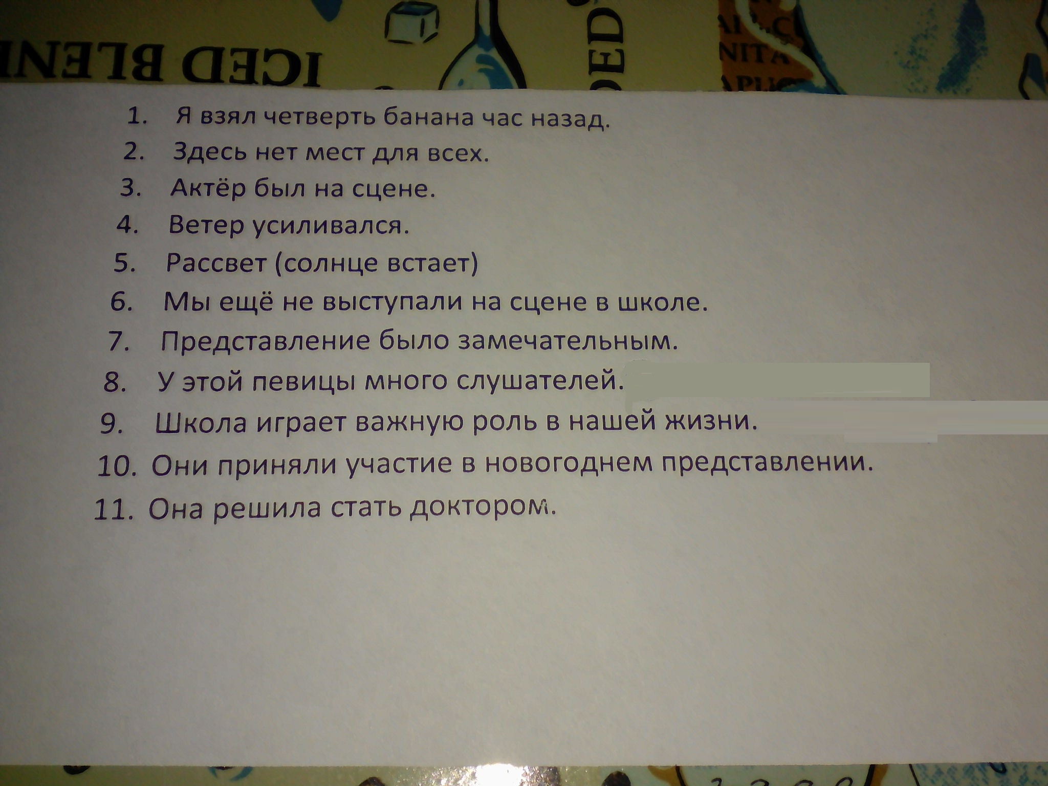 I took a quarter of a banana an hour ago. No place in here for everyone. The actor was on stage. The wind was getting worse. Dawn (the sun rises) We have not yet acted on stage in school. The view was wonderful. This singer has a lot of students, the School plays an important role In our lives. 10 They took part In the new year 11 She decided to become a doctor.