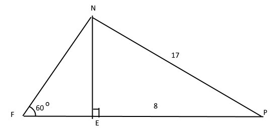 Помогите решить задачу .Высота NE треугольника FNP делит его сторону FP на отрезки FE и PE. Найдите длину отрезка NF, если EP= 8 см, NP= 17 см, угол F= 60 градусов.