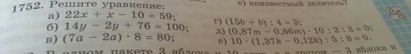 Решите уравнение: а)22x+x-10=59 b)14y-2y+76=100 в)(7a-2a)•8=80 г)(15b+b):4=3 д)(0,87m-0,66m)•10:2:3=0 е)10•(1,37k-0,12k):5:8=0.