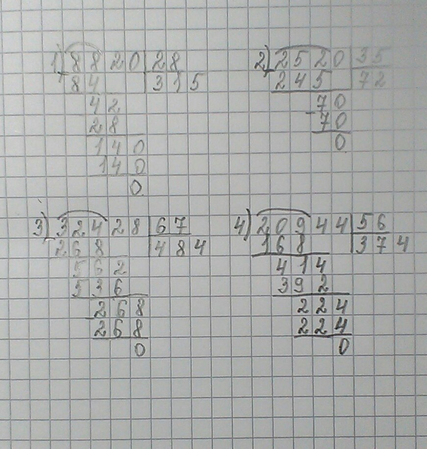 8 820: 28, 2520: 35, 32428 : 67, 20 944 : 56 помогите решить столбиком если не умеете писать на клавиатуре столбиком отправьте фотку мне оч надо!(