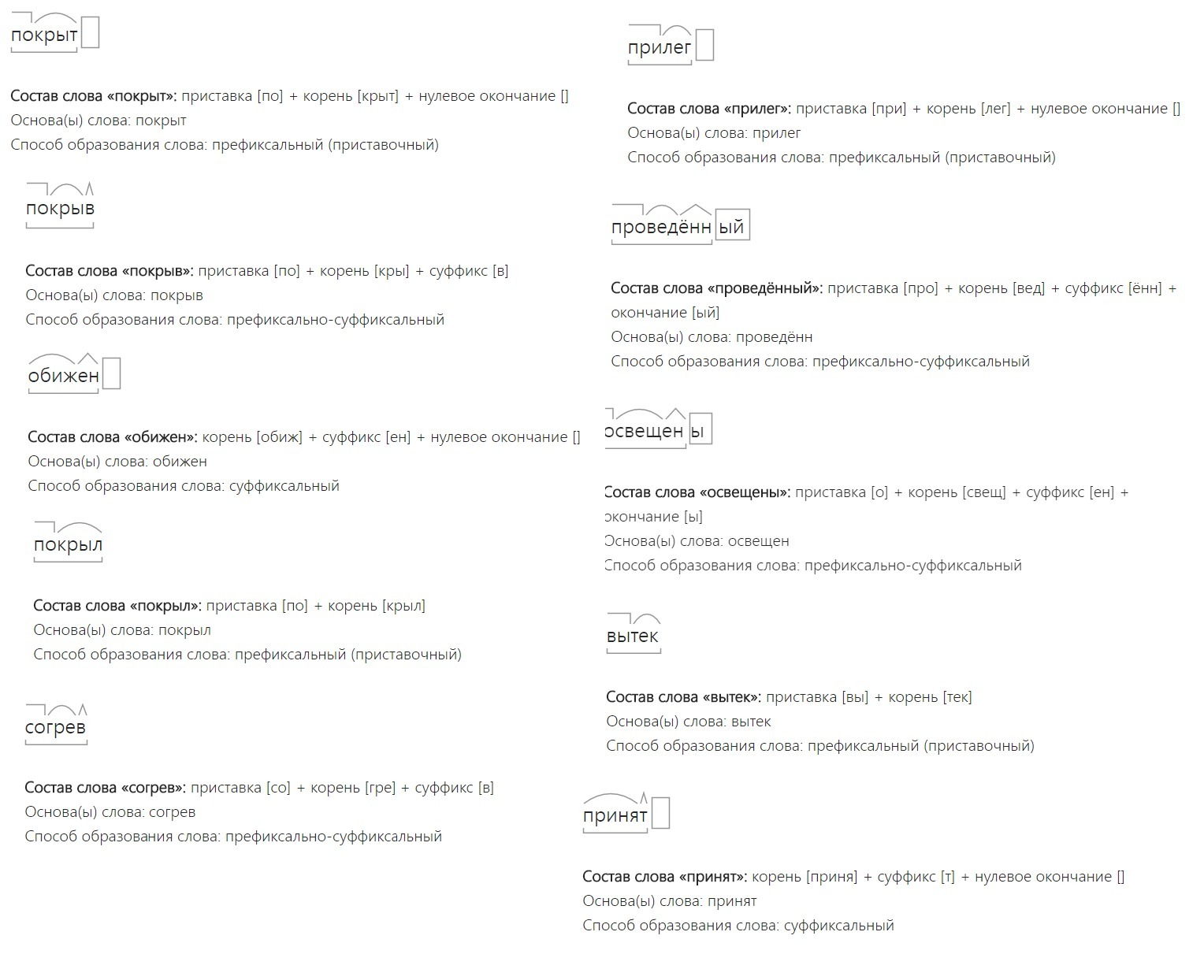 разобрать по составу слова и определить часть речи покрыт покрыв обижен покрыл пртилёг проведённый освещены вытек согрев принят
