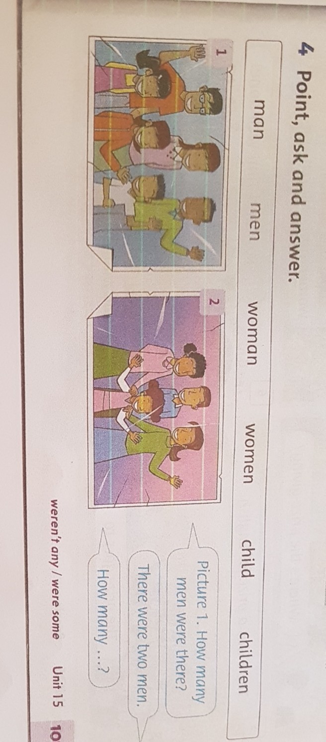 1)men,woman,children. 2)man, women, child. Picture 2. How many women were there? There were two women