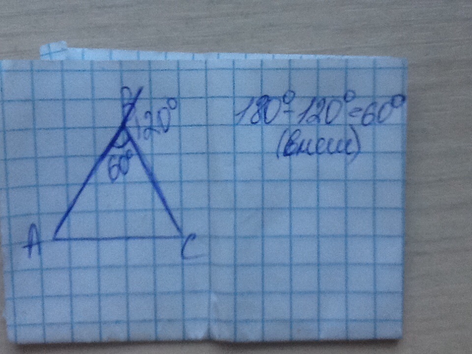 внешний угол при вершине B треугольника ABC равен 120 чему равен угол B в треугольнике ABC