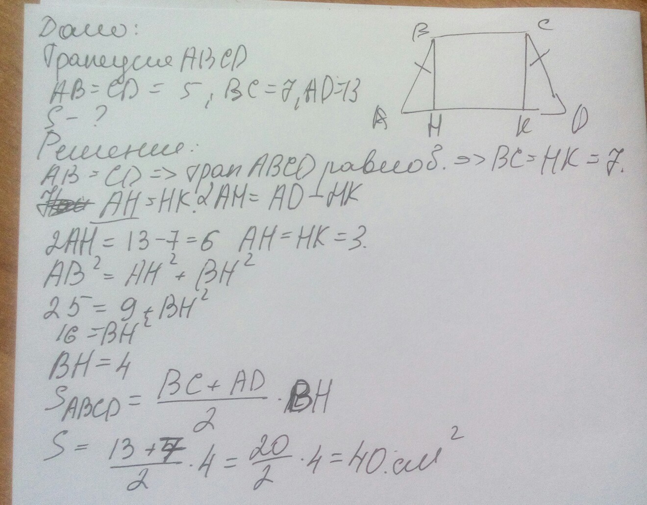 Найдите площадь трапеции ABCD с основаниями AD и BC если AB=CD=5см BC=7см AD=13см Решите пожалуйста с чертежом и дано