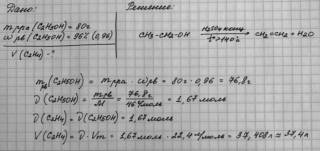 Вычислите объём этилена (н.у.), полученного из 80 г раствора этилового спирта (массовая доля этилового спирта 96%).