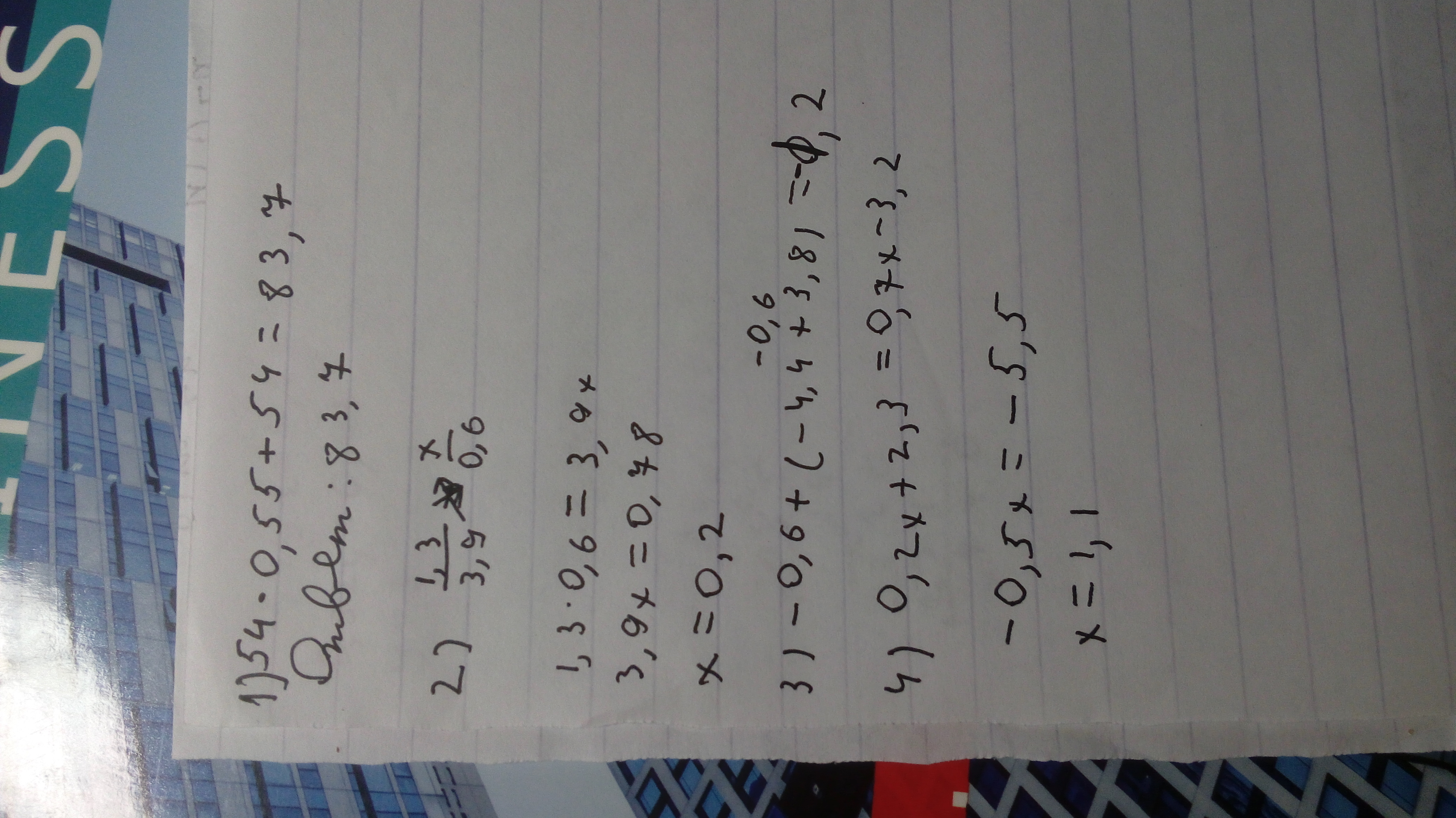 Помогите пожалуйста,решить. 1 задача: В первый день продали 54 кг печенек,что составляет 45% всех печенек. Сколько всего кг печенек было в магазине? ; 2 уравнение: 1,3 : 3,9 = х : 0,6 ; 3 пример: -0,6 + ( -4,4 + 3,8) ; И 4 уравнение: 0,2х + 2,3 = 0,7х - 3,2 . Заранее большое спасибо.