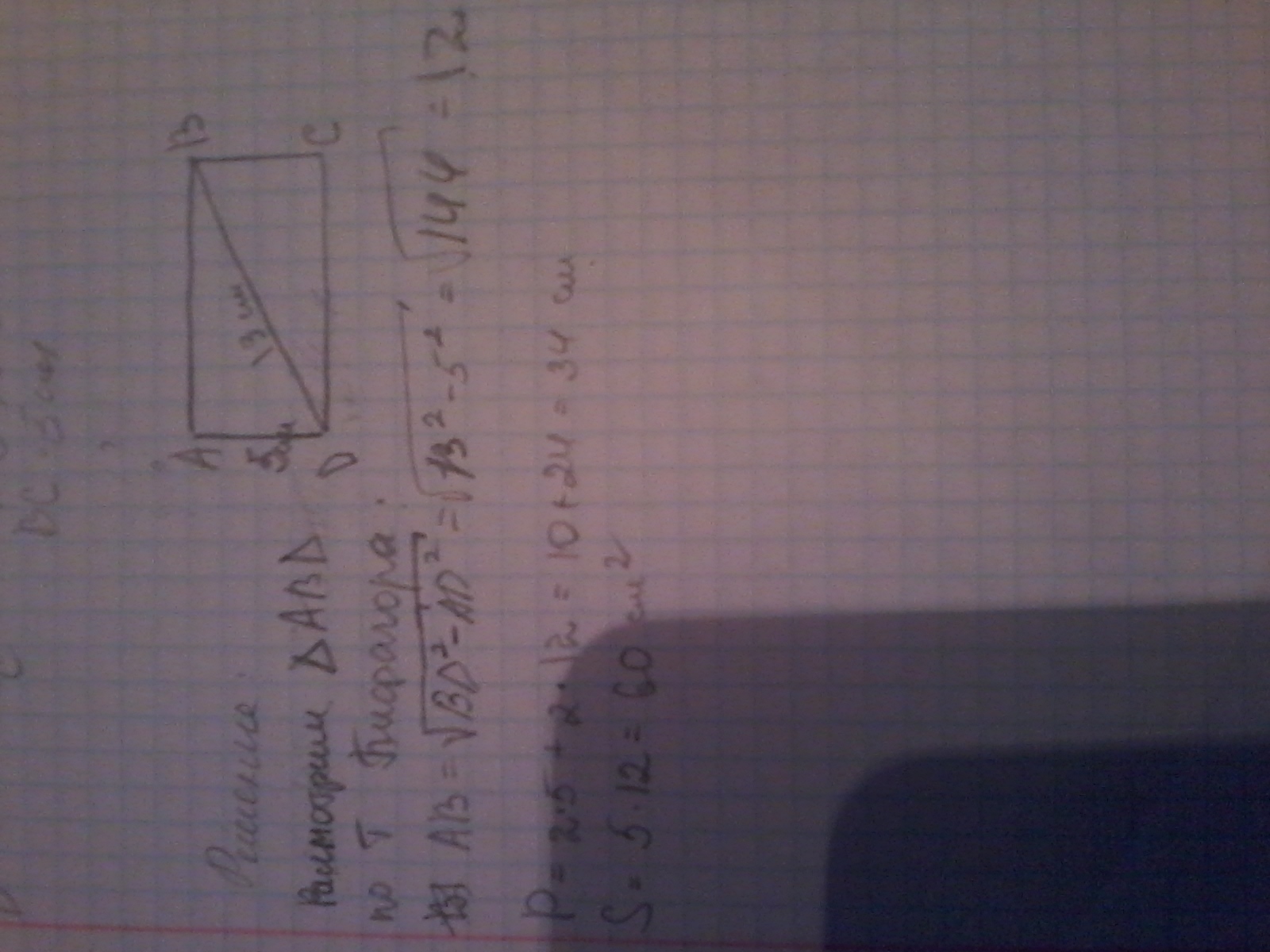 диагональ прямоугольника рвана 13 см а одна из строн 5 см найдите площадь и пириметр прямоугольника