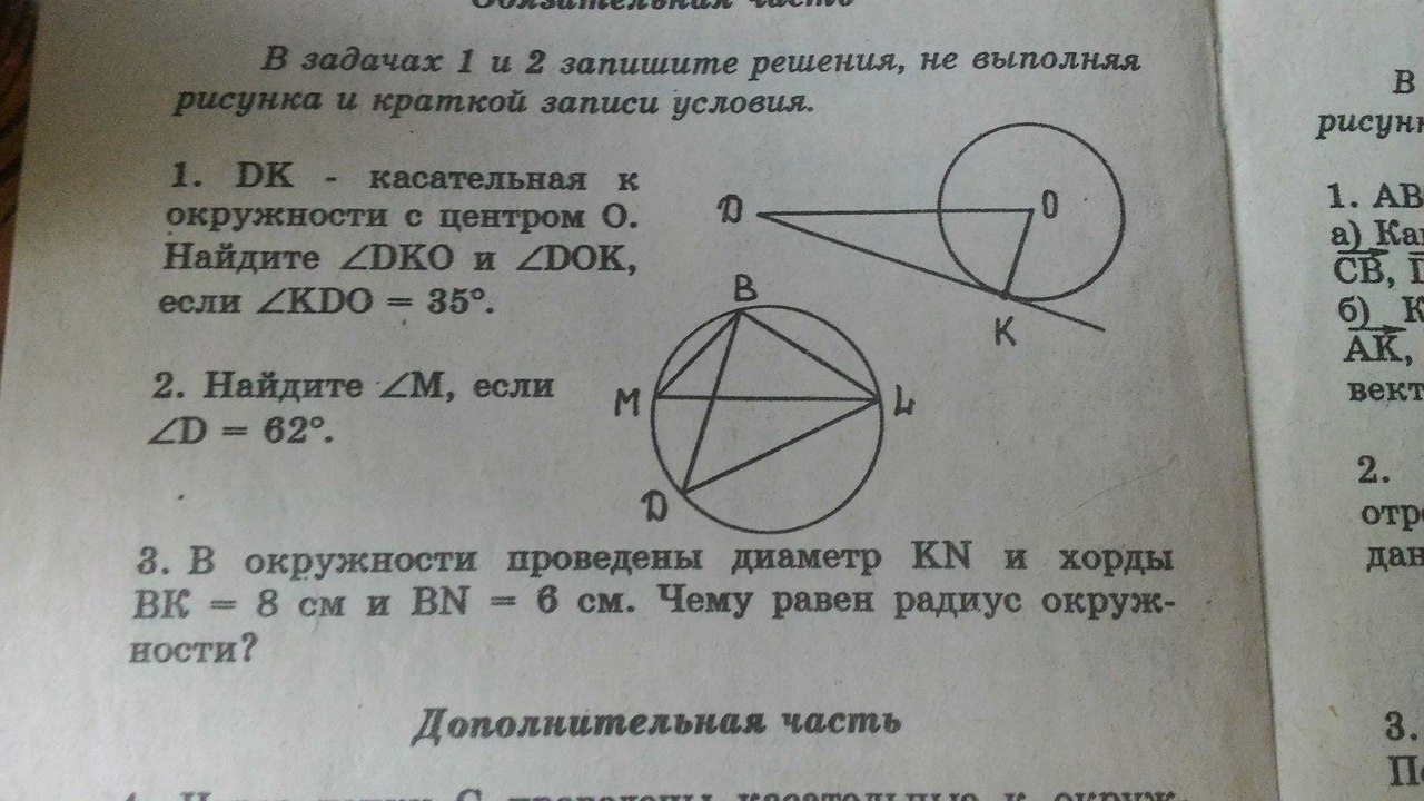 2. Вписанные углы, опирающиеся на одну и ту же дугу (хорду), равны. Значит, если ∠D=62°, то и ∠M=62°(т.к. опираются на одну и ту же дугу (хорду) BL).